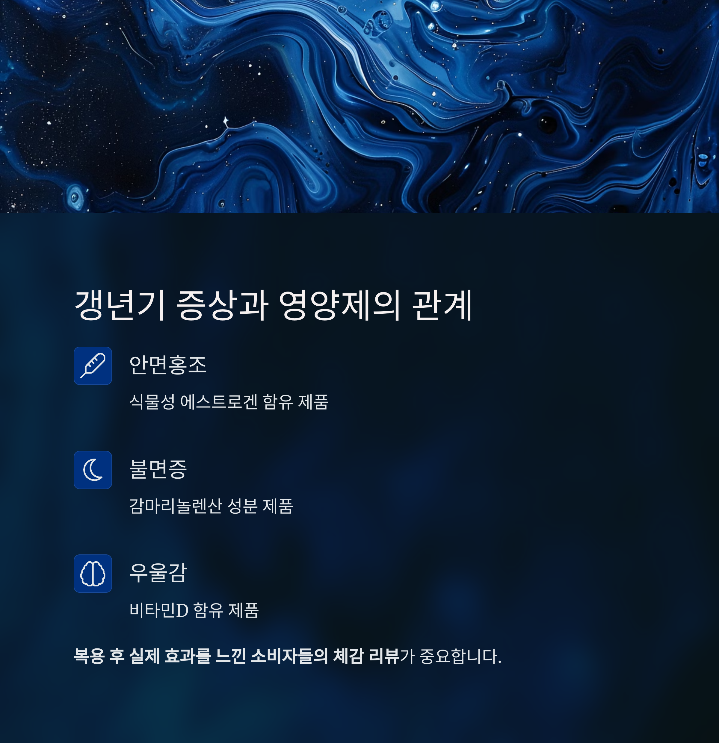| 뉴O노 | 이소플라본, 비타민D | 4.0 | 땀 억제, 기분 안정 |