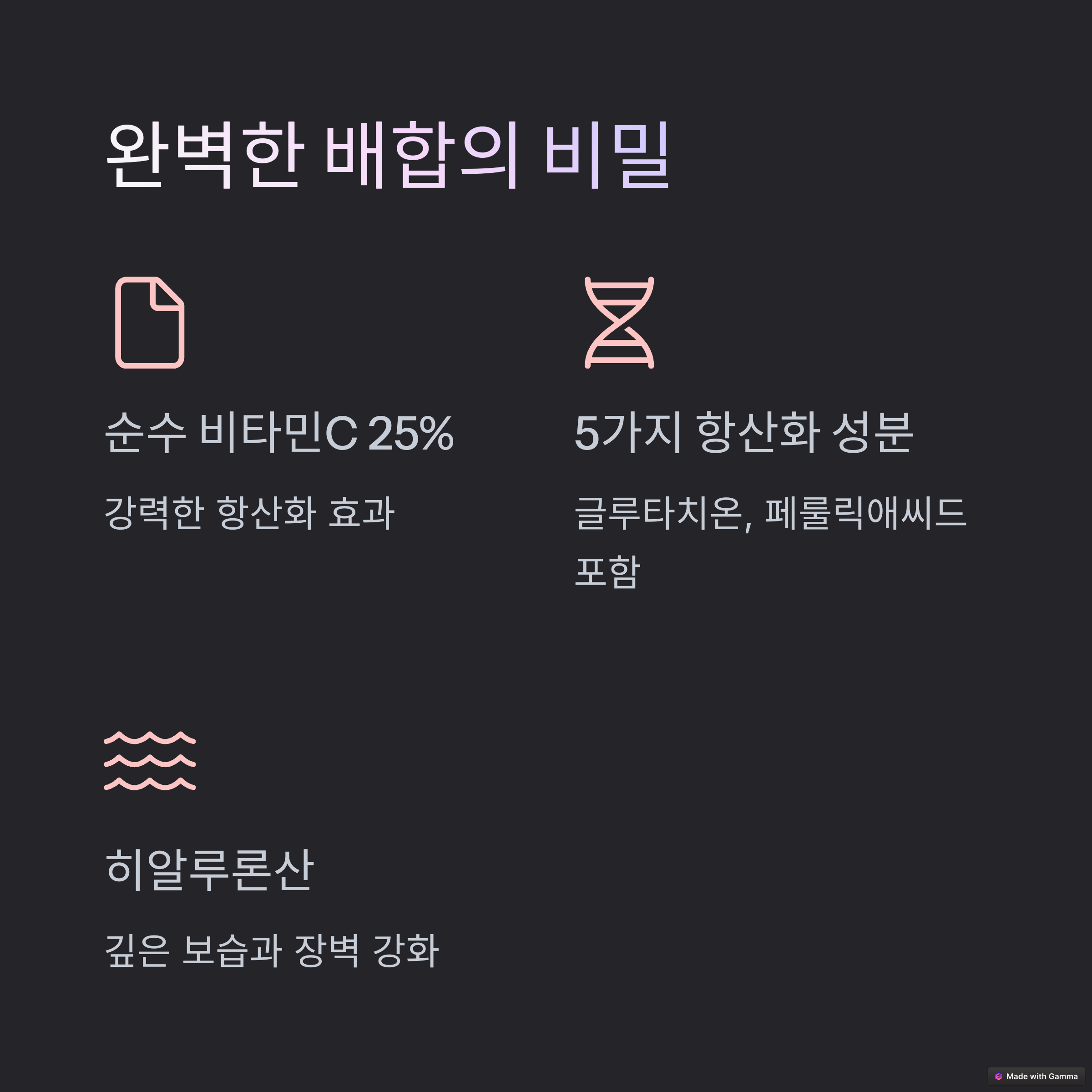 | 고농축 비타민C | 피부 톤 개선과 생기 부여에 탁월한 효과 |
