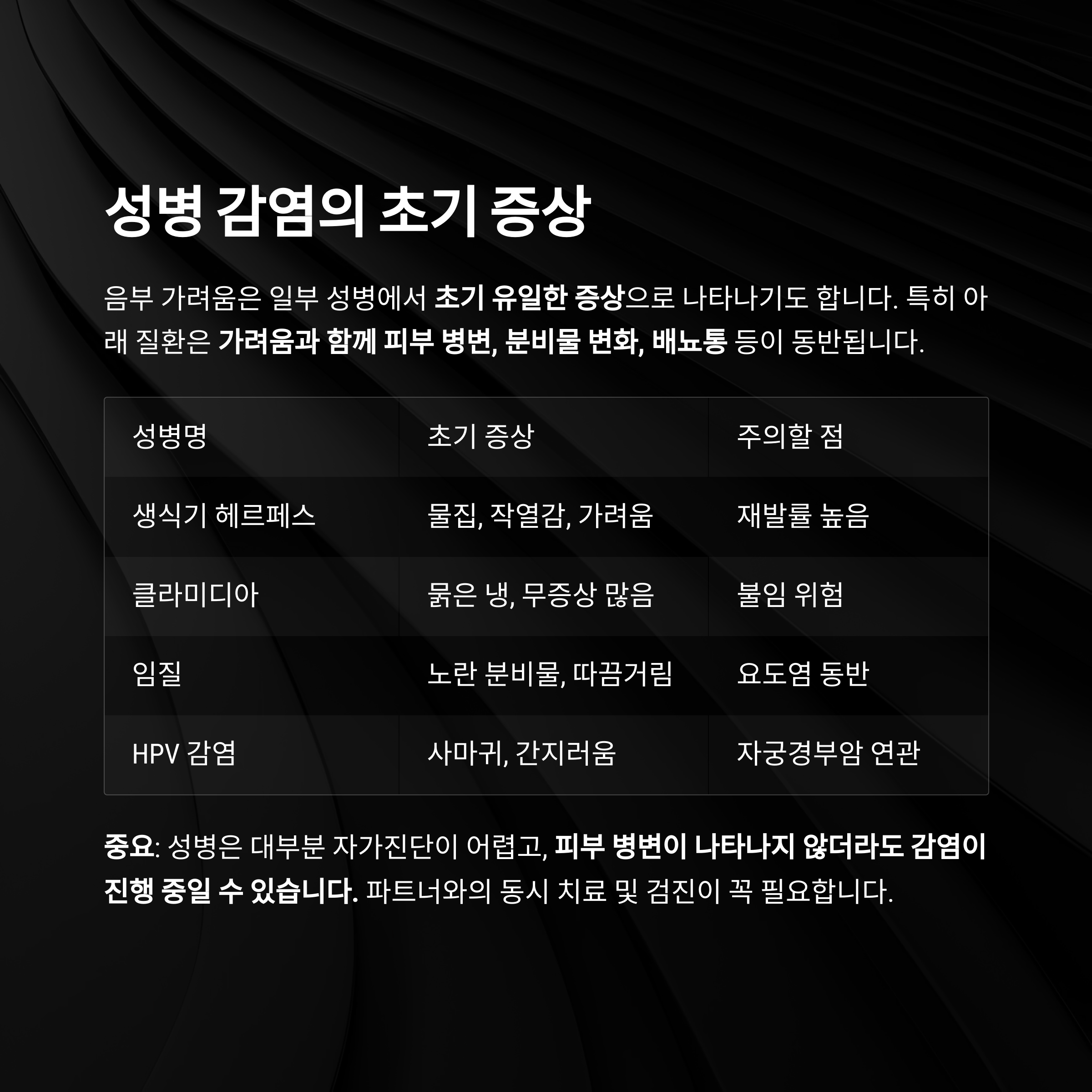 중요: 성병은 대부분 자가진단이 어렵고,