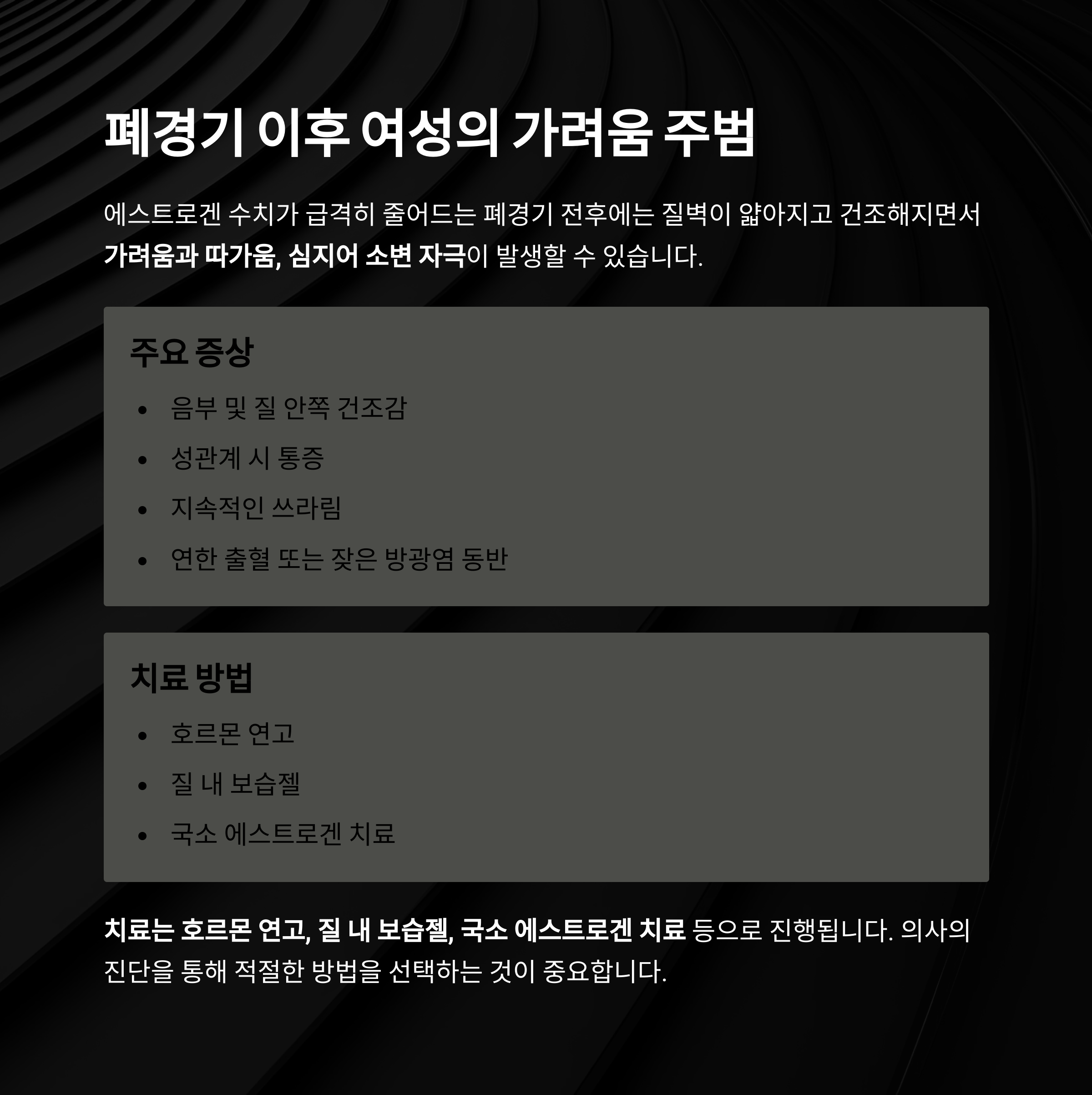 | 산부인과 전문의가 알려주는 질 건조증 4가지 증상과 치료 핵심 정보 (2) | 2025.04.30 |