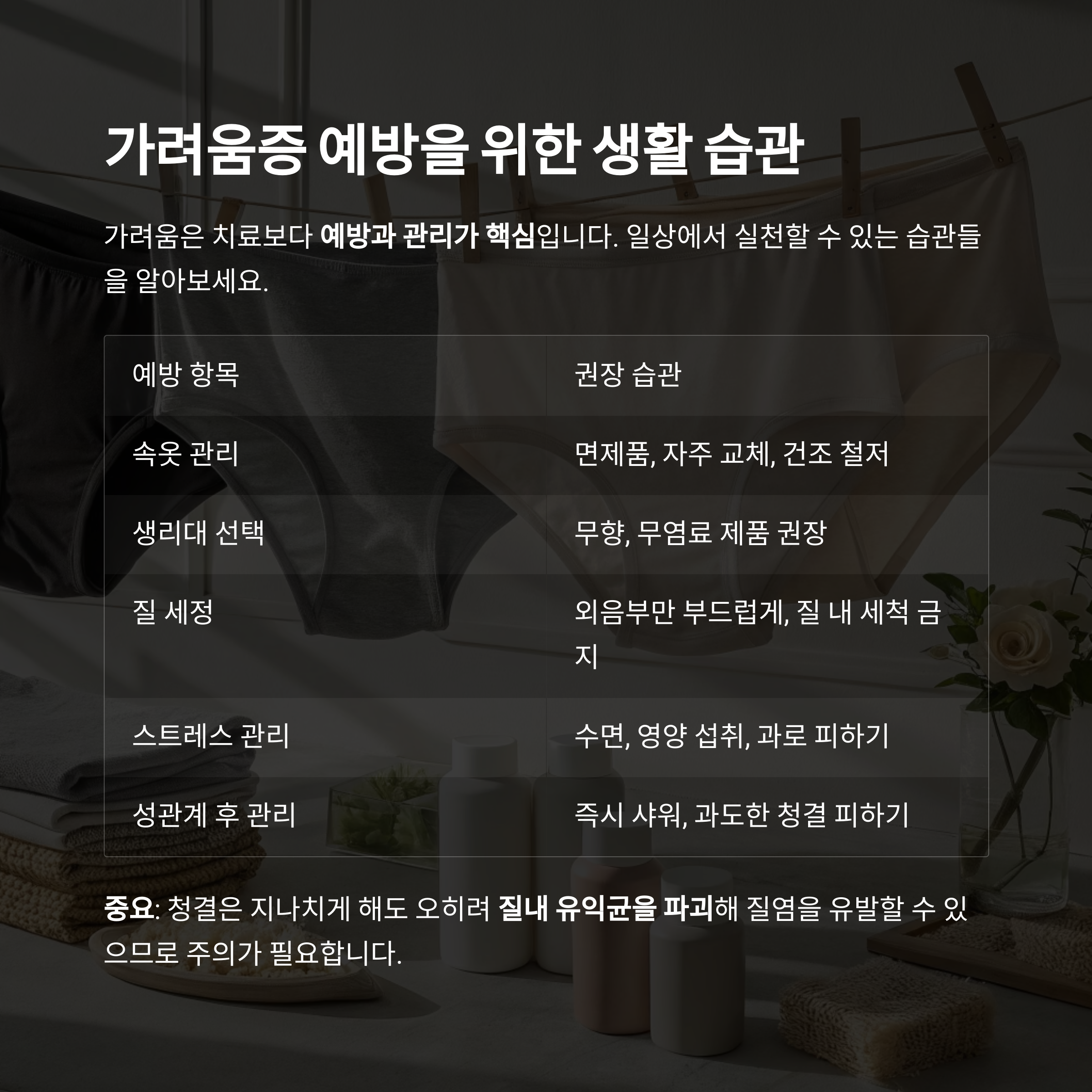 | 속옷 관리 | 면제품, 자주 교체, 건조 철저 |