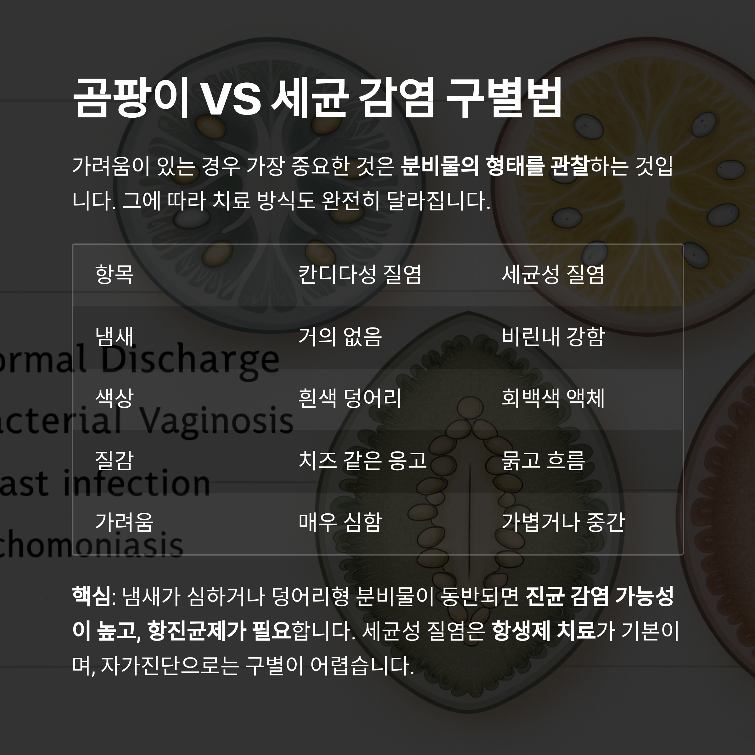 핵심: 냄새가 심하거나 덩어리형 분비물이 동반되면