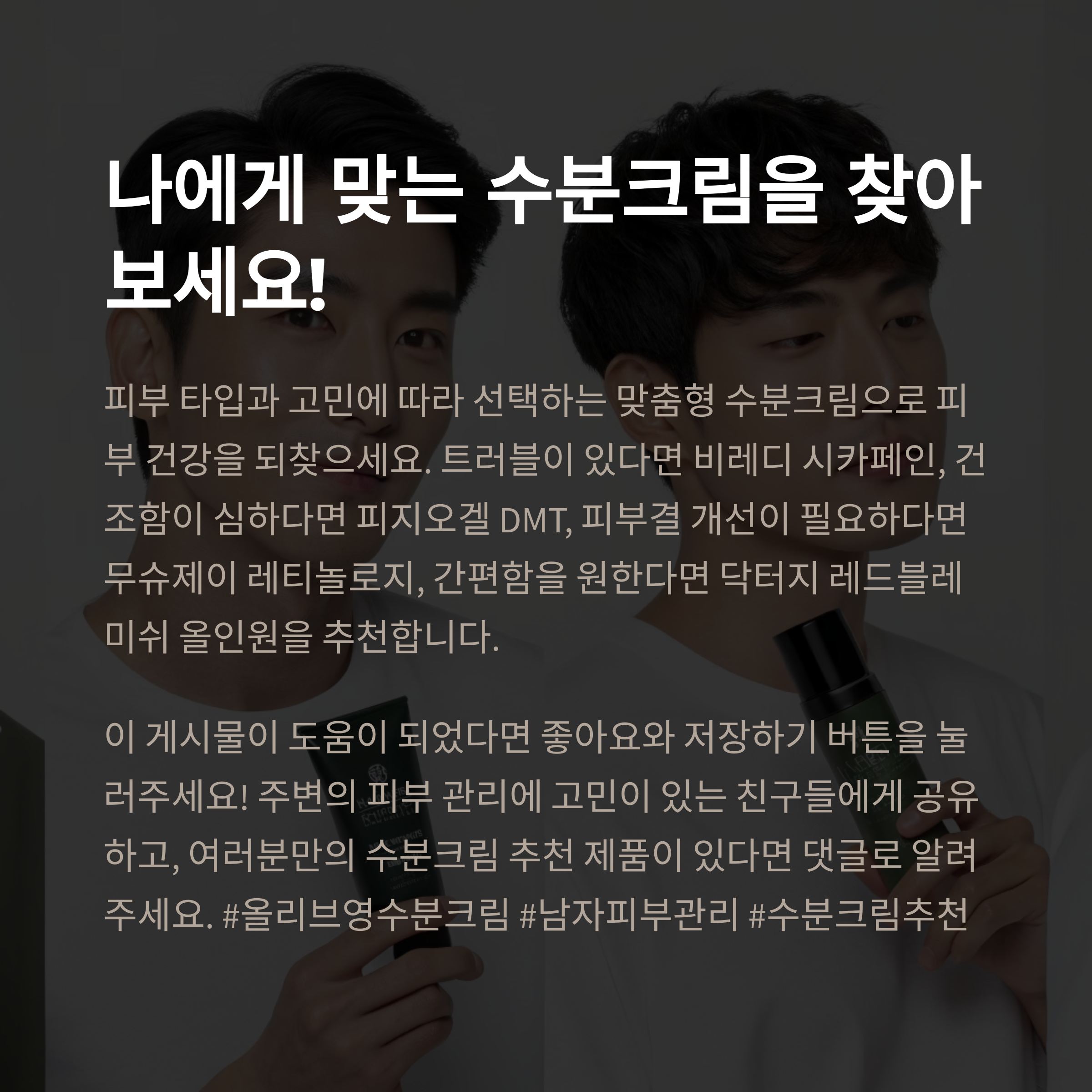 많은 분들이 올리브영에서 남성용 수분크림을 고를 때 고민이 많으시죠. 20대, 30대 남성은 유분과 수분 밸런스를 잘 맞춰야 피부 트러블을 줄일 수 있고, 매끈한 피부결을 유지할 수 있습니다. 특히 날씨가 건조하거나 마스크 착용으로 피부에 자극이 많은 요즘 같은 시기엔, 자신에게 맞는 수분크림을 선택하는 것이 피부 건강을 지키는 지름길입니다. 그래서 오늘은 피부 타입별로 추천하는 수분크림을 정리해드리려 해요. 기초템부터 트러블, 건조함, 피부결 관리까지 각자의 상황에 맞는 제품을 골라보세요. 모든 제품은 끈적임 없이 산뜻하게 흡수되며, 바르기 쉬운 제형으로 데일리 케어에 부담 없이 사용할 수 있는 아이템들입니다. 이제부터 올리브영에서 찾을 수 있는 남성 수분크림의 세계를 함께 알아볼까요?