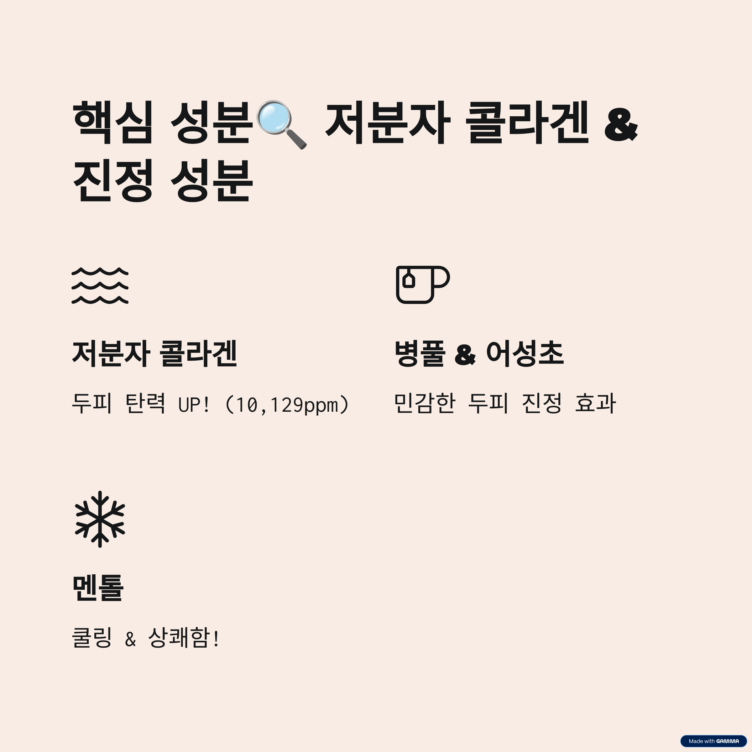 | 저분자 콜라겐, 병풀, 어성초, 멘톨 | 두피 진정, 각질 제거, 모발 윤기 회복 | 민감성 두피, 탈모 고민, 남녀노소 모두 |