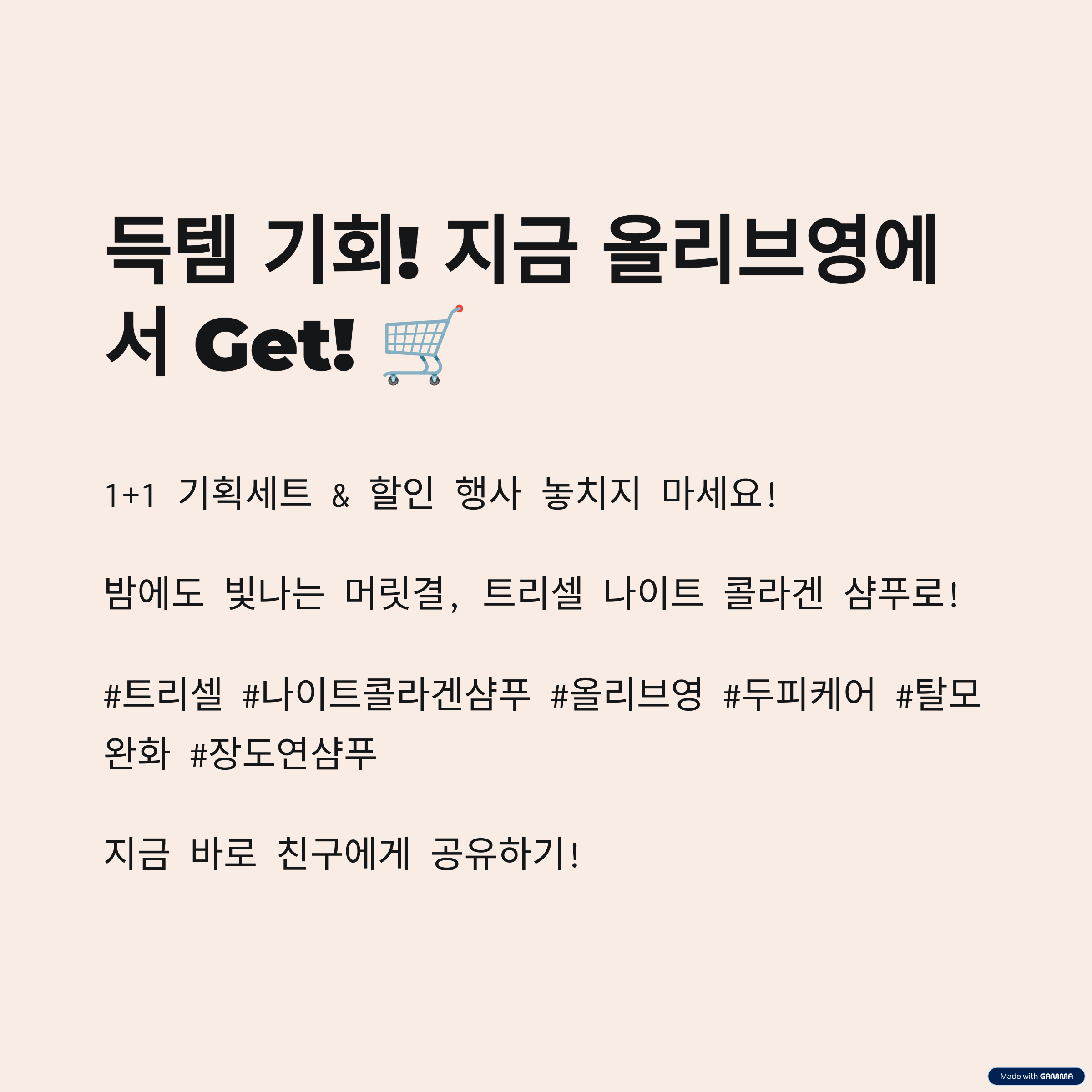 트리셀 나이트 콜라겐 샴푸는 단순히 세정에만 그치지 않고, 두피와 모발 건강까지 생각한 프리미엄 케어 제품입니다. 고기능 성분 조합과 사용자 편의성을 동시에 잡은 이 제품은 바쁜 일상 속에서도 나만의 케어 루틴을 지켜주는 강력한 도우미가 되어줍니다. 꾸준히 사용한다면 두피의 청결뿐 아니라 탈모 증상 완화에도 긍정적인 변화를 기대할 수 있으며, 부드러운 향과 풍성한 거품은 일상 속 힐링 타임을 선사합니다. 무엇보다 올리브영에서의 1+1 구성은 경제적인 측면에서도 만족스러운 선택이 될 것입니다. 지금 바로 루틴에 트리셀 나이트 콜라겐 샴푸를 추가해보세요.