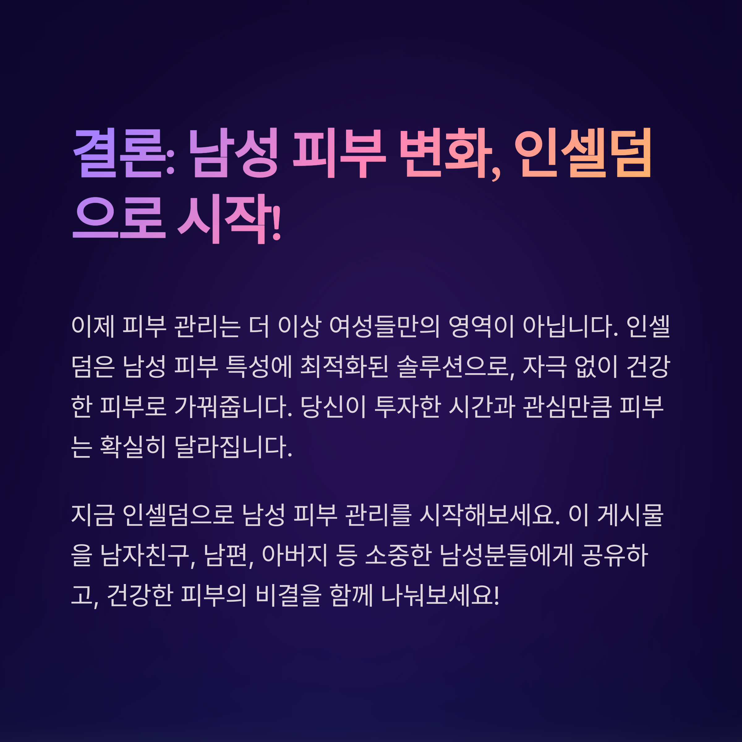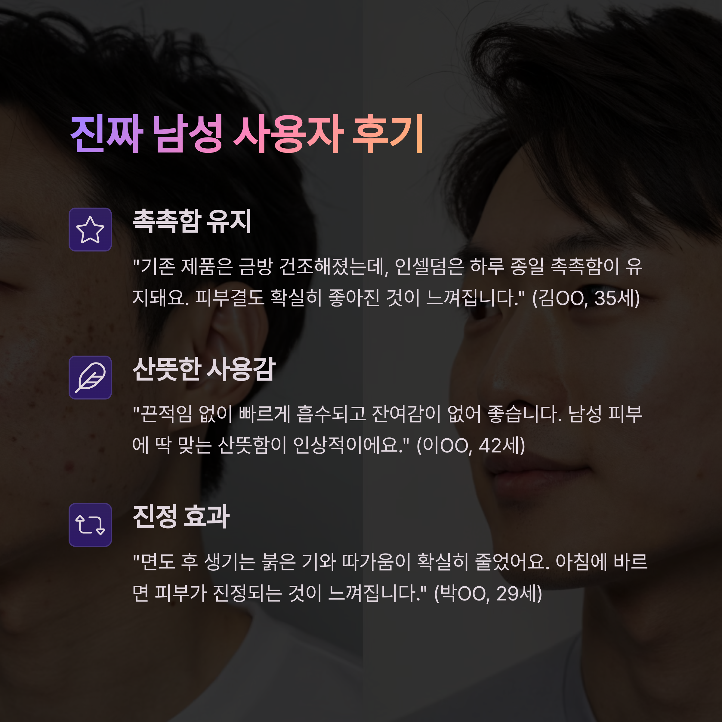 인셀덤은 자연 유래 성분과 무자극 포뮬러로 구성되어 있어 남성 피부에도 자극 없이 사용할 수 있으며, 민감성 피부 타입도 안심하고 사용 가능합니다.
