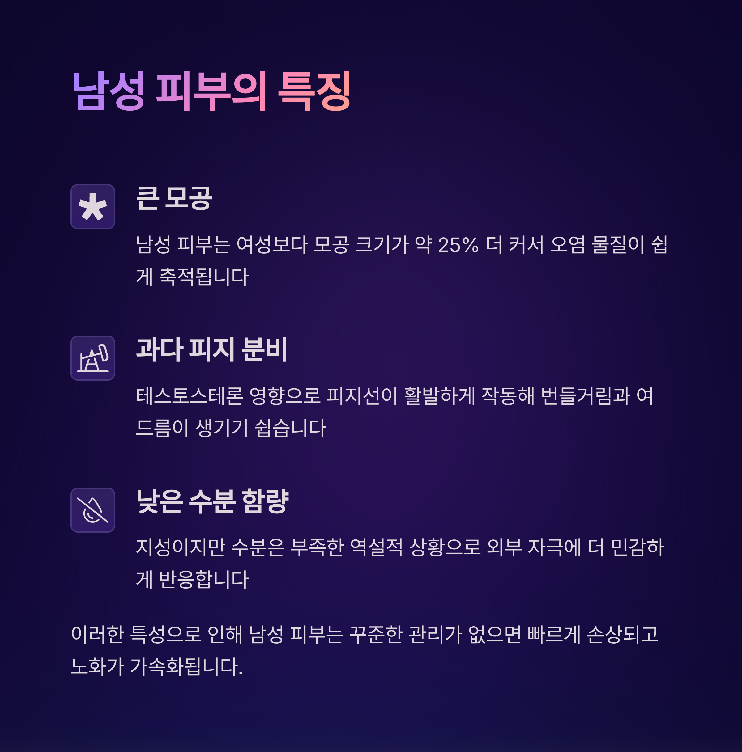 남성 피부 특징 피지 분비 많고 모공 크며 수분 적음