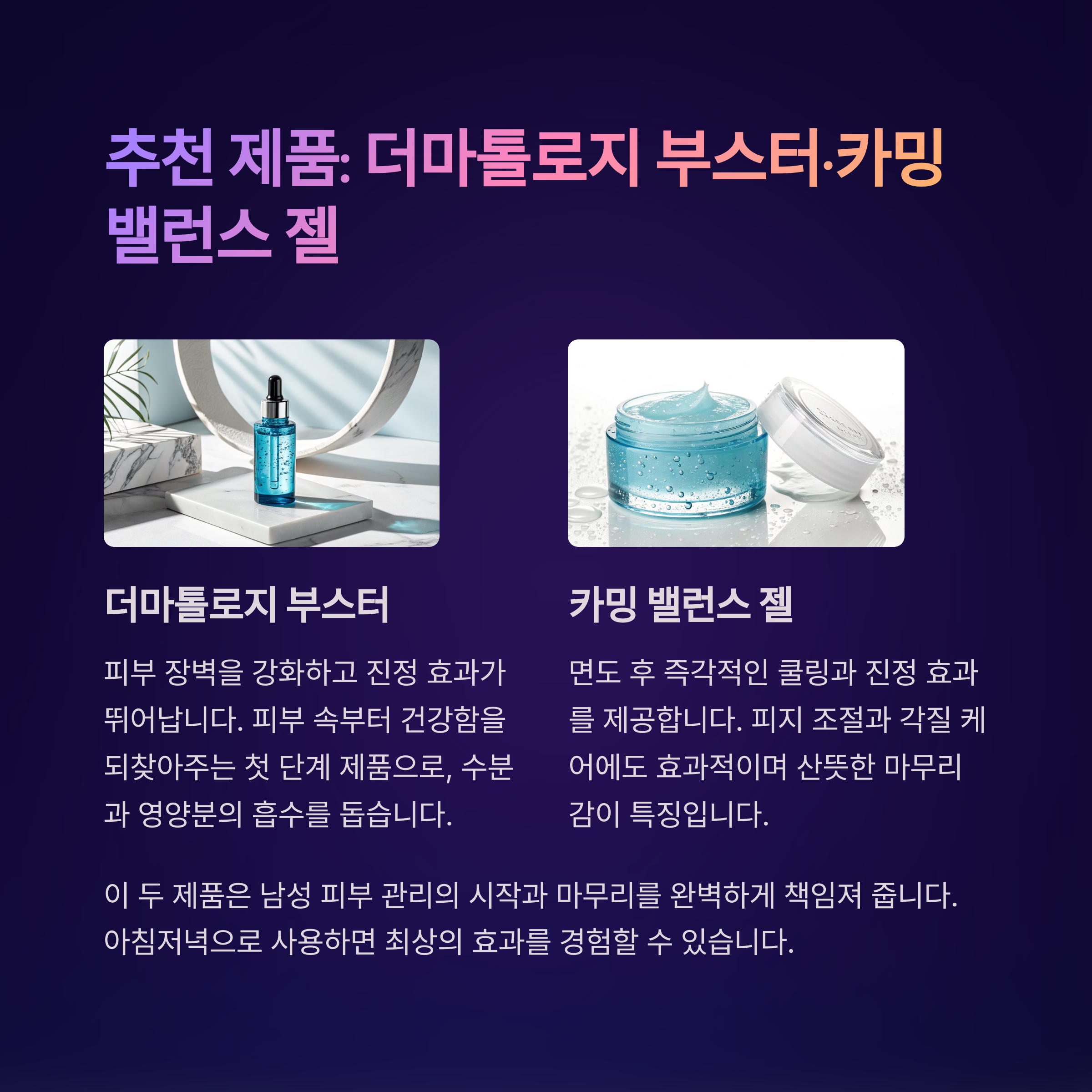 특히 더마톨로지 부스터카밍 밸런스 젤의 조합은 면도 후 붉어짐이나 열감을 느끼는 남성들에게 큰 호평을 받고 있습니다. 더마톨로지 부스터는 피부의 장벽을 강화해주며, 카밍 밸런스 젤은 빠른 진정 효과를 제공하여 면도 후에도 자극 없이 편안한 느낌을 주는 것이 특징입니다. 수분 공급과 동시에 진정 효과까지 잡은 이 두 제품은 남성 피부 고민에 특화된 솔루션으로 주목받고 있습니다.